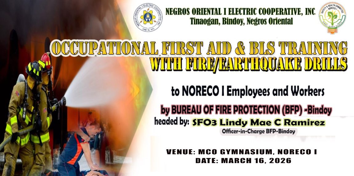 Today, March 16, 2026, NORECO I Headquarters successfully held its Occupational First Aid Training and Earthquake/Fire Drills facilitated by the BFP Bindoy, in compliance with DOLE and NEA advisories. This initiative equipped our personnel with essential first aid and life-saving skills, ensuring safety and preparedness in emergency situations.